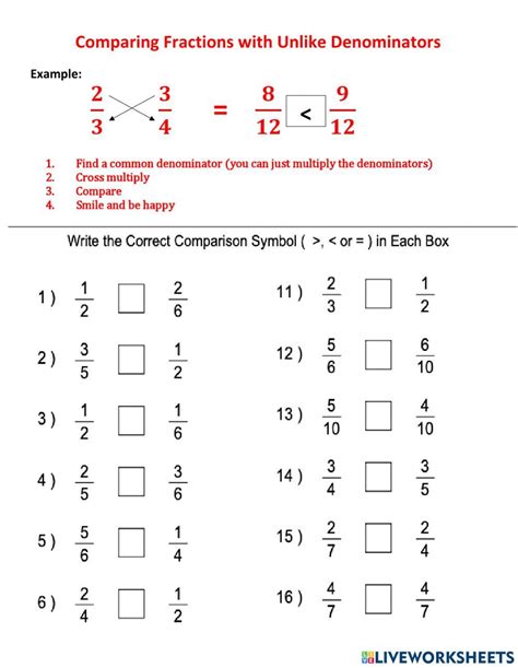 A unit fraction is a fraction where the numerator is 1 (the denominator can be any other whole number). Comparing fractions with unlike denominators. To compare fractions with unlike denominators, follow these steps: